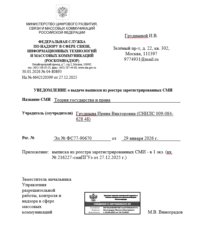 С 2026 г. научно-правовой журнал «Теория государства и права» включен в Российский индекс научного цитирования (РИНЦ) и зарегистрирован в Научной электронной библиотеке eLIBRARY.RU.