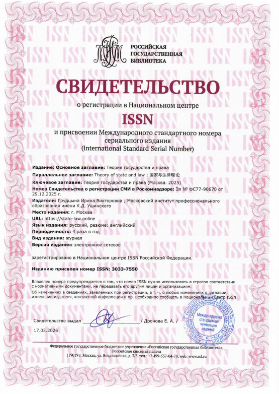 Since 2026, the scientific and legal journal « Theory of state and law» has been included in the Russian Scientific Citation Index (RSCI) and registered in the Scientific Electronic Library eLIBRARY.RU.